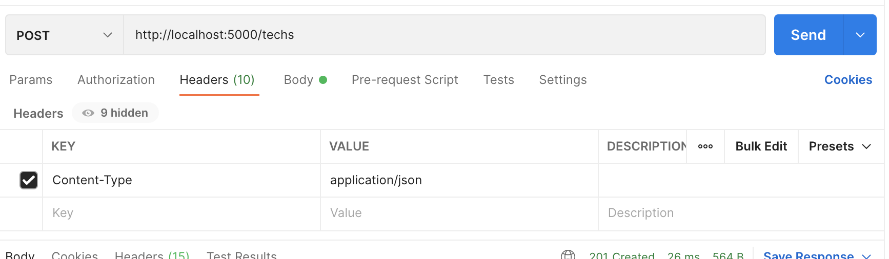 http://localhost:5000/techs에 POST 요청을 해보자.