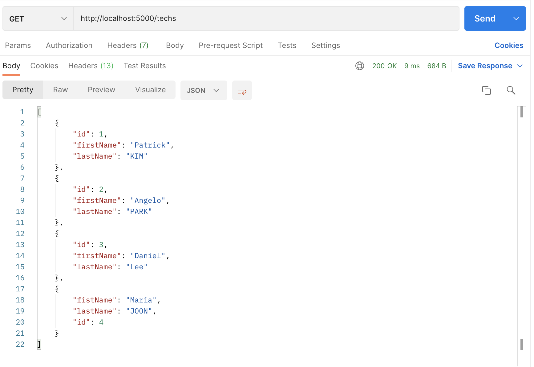 잘 설정이 되었는지 확인하기 위해서 techs에 다시 GET 요청을 해보면, 아까와 달리 4개가 되어있는 것을 볼 수 있다.