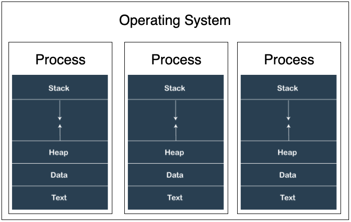 Stack은 매개변수, 지역 변수 등 임시적인 자료가 저장되는 공간이고, Heap은 동적으로 할당되는 메모리이며, Data에는 전역 변수가 들어오게 되고, Text(or Code)는 Program의 코드가 들어오게 된다.