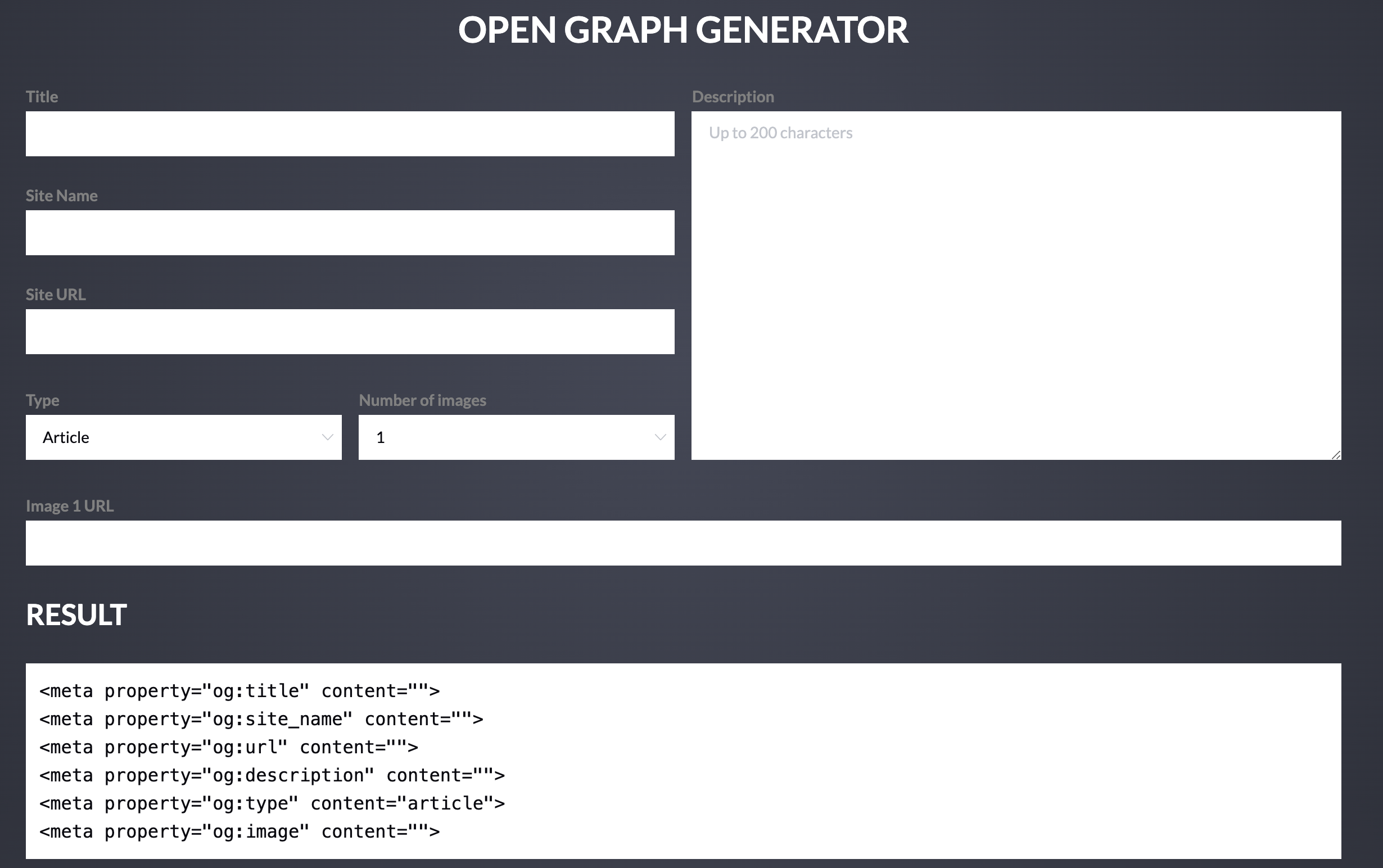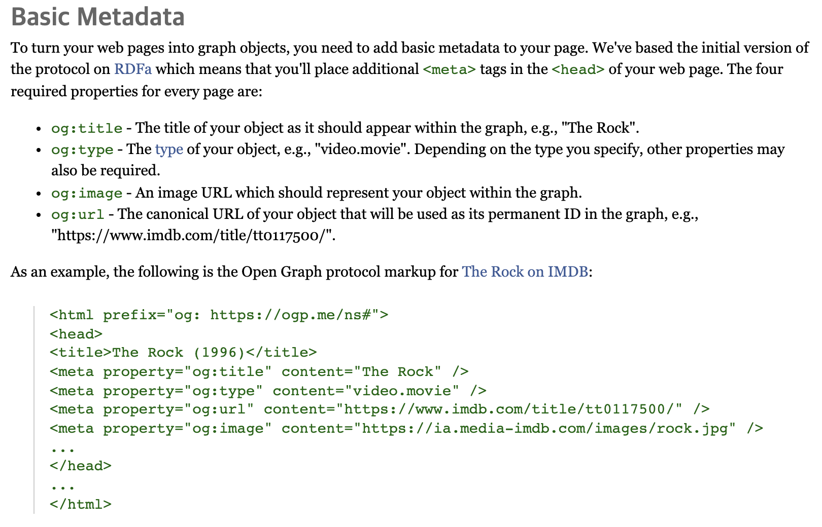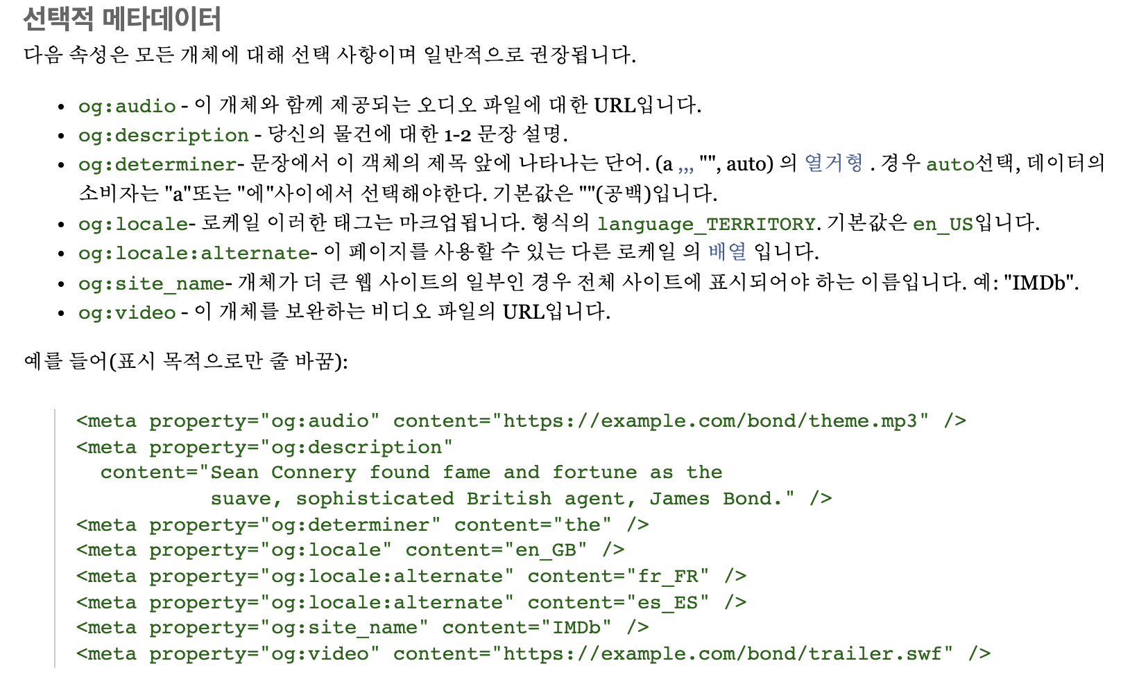 <html prefix="og: https://ogp.me/ns#"> <head> <title>The Rock (1996)</title> <meta property="og:title" content="제목을 넣어주세요" /> <meta property="og:type" content="website" /> <meta property="og:locale" content="ko_KR" /> <meta property="og:locale:alternate" content="en_US" /> <meta property="og:site_name" content="사이트명을 넣어주세요" /> <meta property="og:url" content="사이트 주소를 넣어주세요" /> <meta property="og:description" content="설명글을 넣어주세요" /> <meta property="og:image" content="/favicon.svg" /> <meta property="og:image:type" content="/favicon.svg" /> <!-- 아래는 옵셔널! --> <meta property="og:image:width" content="1200"> <meta property="og:image:height" content="630"> ... </head> <body> ... </body> </html>비교적 간단하지 않은가?