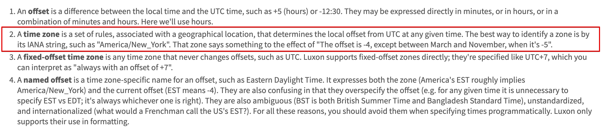그런데 luxon의 Manual에 가보면 아래 이미지의 빨간 박스에서 볼 수 있듯이 IANA를 사용하고 있다고 한다.