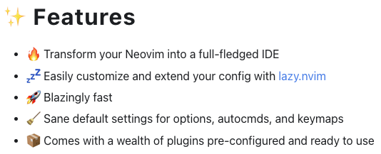 Lazyvim Features 이런 기능들이 있다고 한다. Blazingly fast가 마음에 든다.