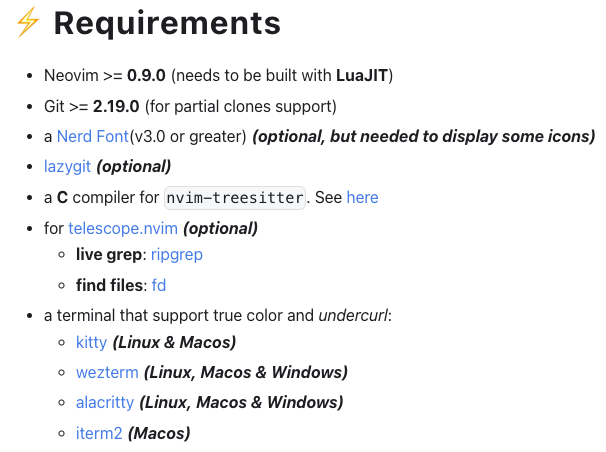Lazyvim Requirements 1. Neovim 0.9.0 이상 버전을 사용해야하는데 Neovim 0.9.4를 사용하고 있다.
