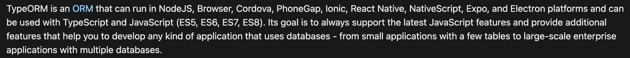 TypeORM web-page 발췌 - TypeORM은 NodeJS, Browser, Cordova, PhoneGap, Ionic, React Native, NativeScript, Expo, Electron 플랫폼에서 실행할 수 있다.