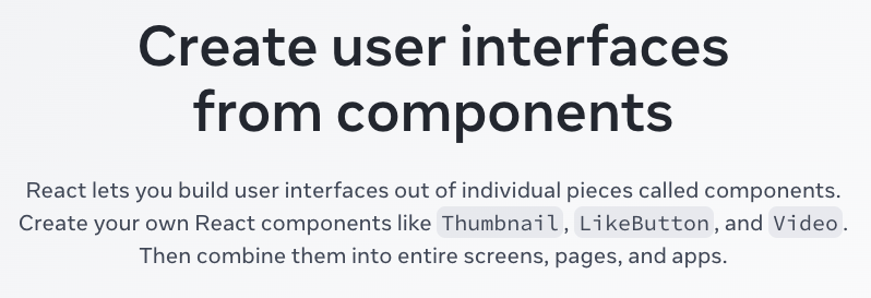 썸네일, 좋아요 버튼, 비디오 등 각각을 개별적인 컴포넌트로 나누어서 관리할 수 있도록 만들고, 이것들을 합쳐서 스크린, 페이지, 앱을 만들게 되는 것이다.