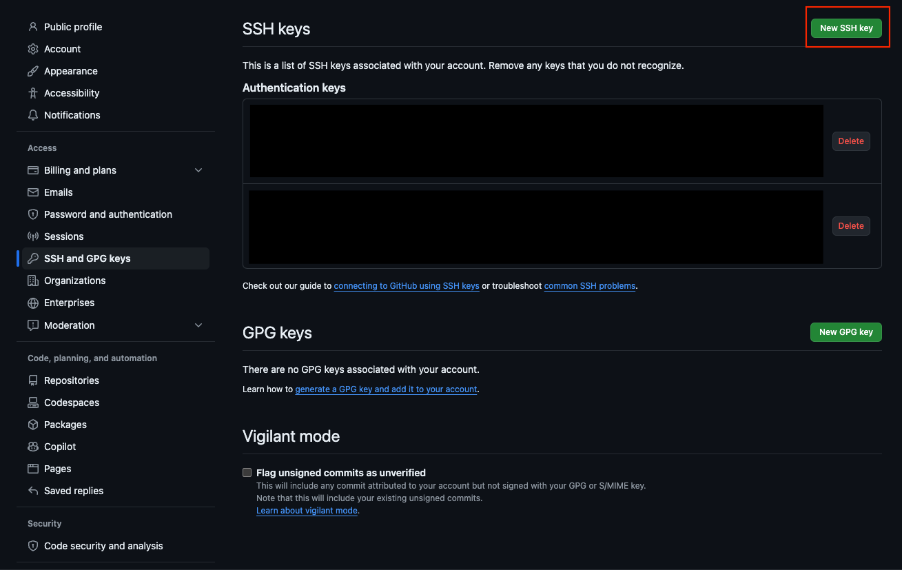 ssh-add -l # 출력 3072 SHA256:lc... 회사계정주소 (RSA) 3072 SHA256:bq... 회사계정주소2 (RSA) 3072 SHA256:CI... 개인계정ㅈ두소 (RSA)2. 깃허브에 새로운 SSH 공개 Key 추가