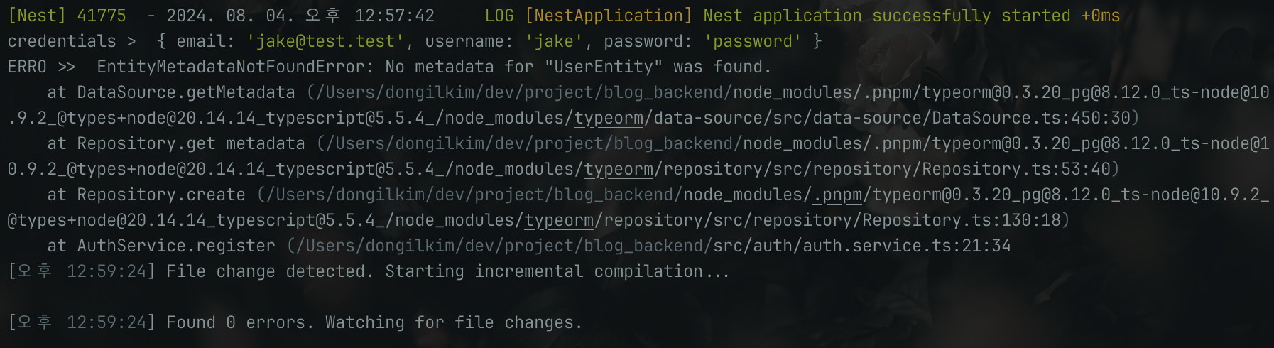 Post 요청에 의해서 postman에서 날린 email, username, password는 찍히는데 이 후 try catch 문에서 catch로 계속 빠지고 있었고, 그 이유가 EntityMetadataNotFoundError 였다.