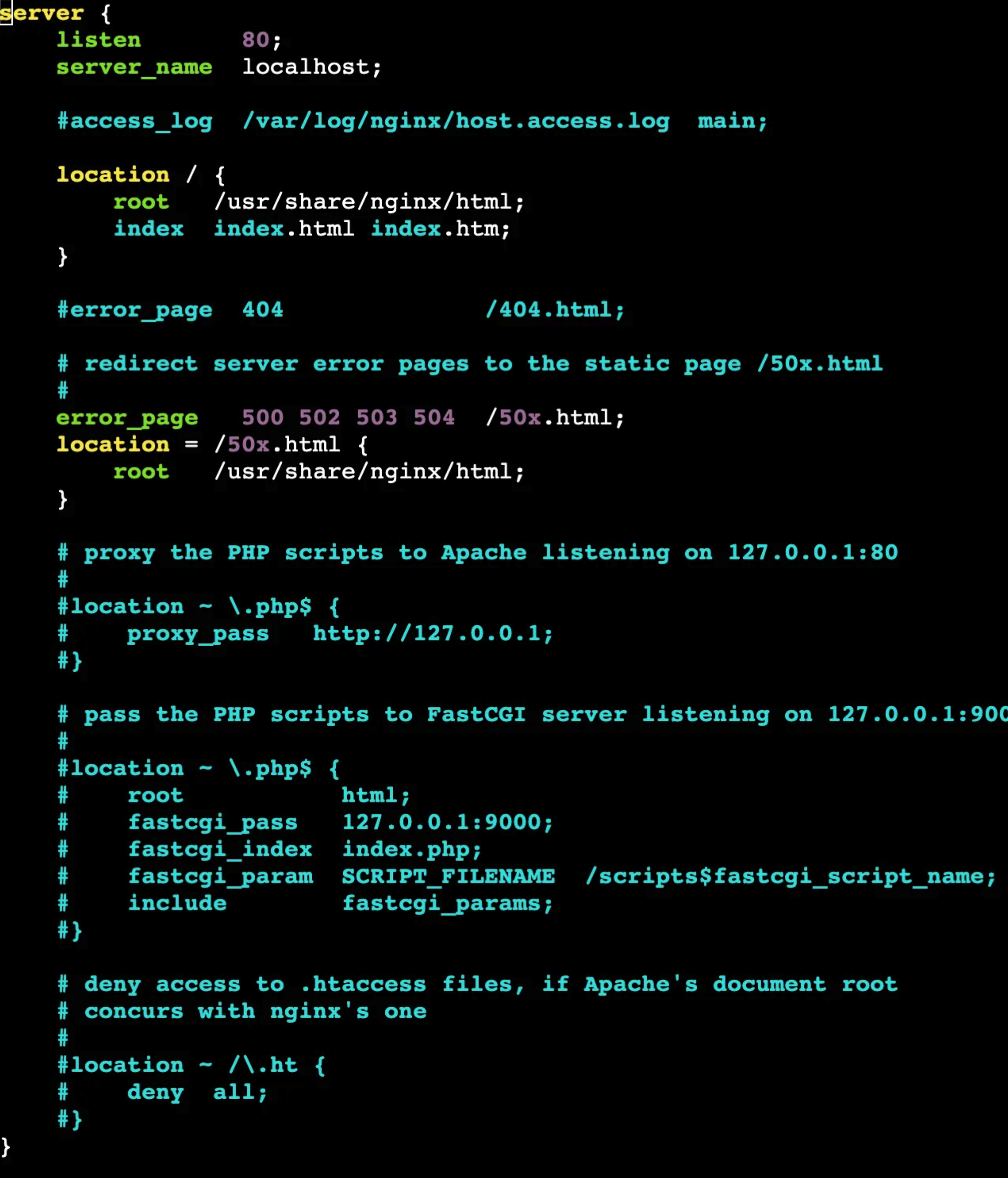 1(default.conf)은 Nginx에서 가장 근본이 되는 루트 설정 파일이며, 워커 프로세스 개수, 로그 저장 위치 등 전역적으로 설정되어야 하는 것들이 포함되어있다.