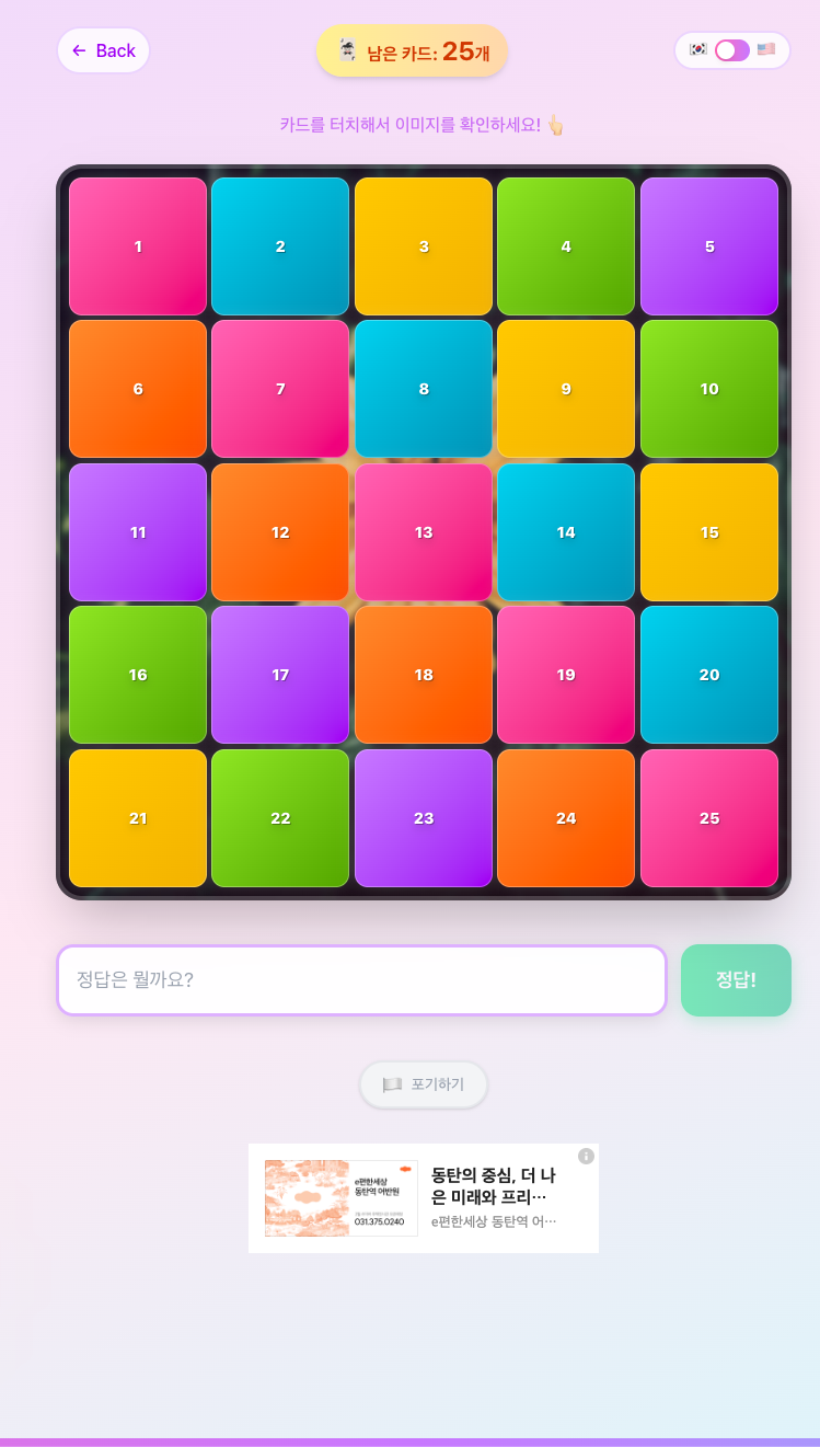 원하는 이미지를 넣는다 → 정답을 입력한다 → 그리드 사이즈를 설정한다 → 호스트가 어떤 기준을 가지고 그리드를 하나씩 제거한다 → 이미지에 대한 정답을 입력한다